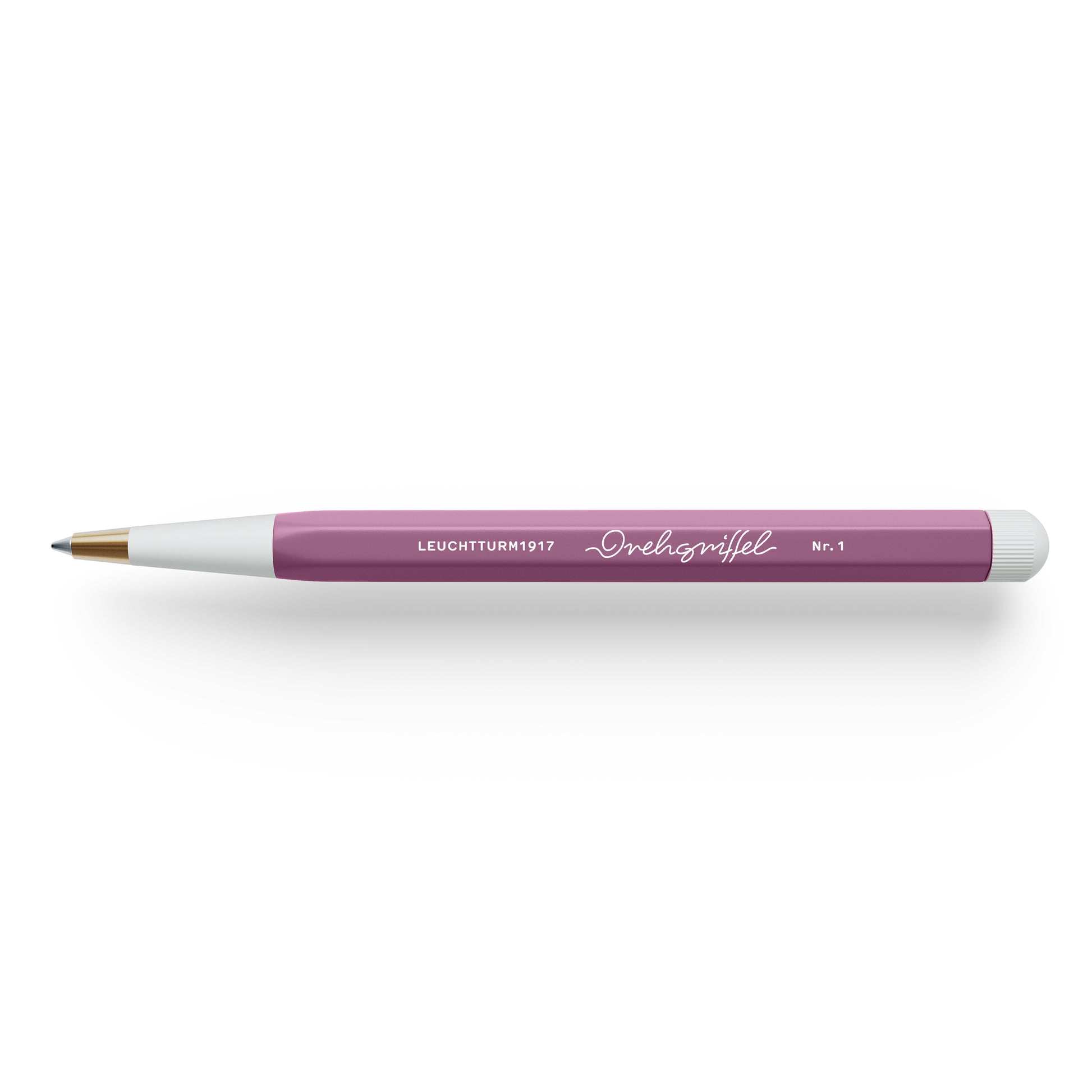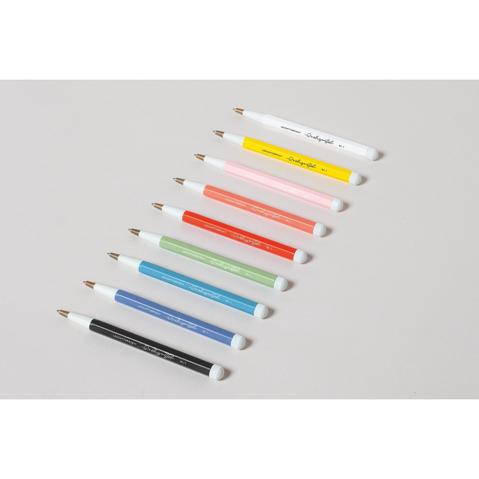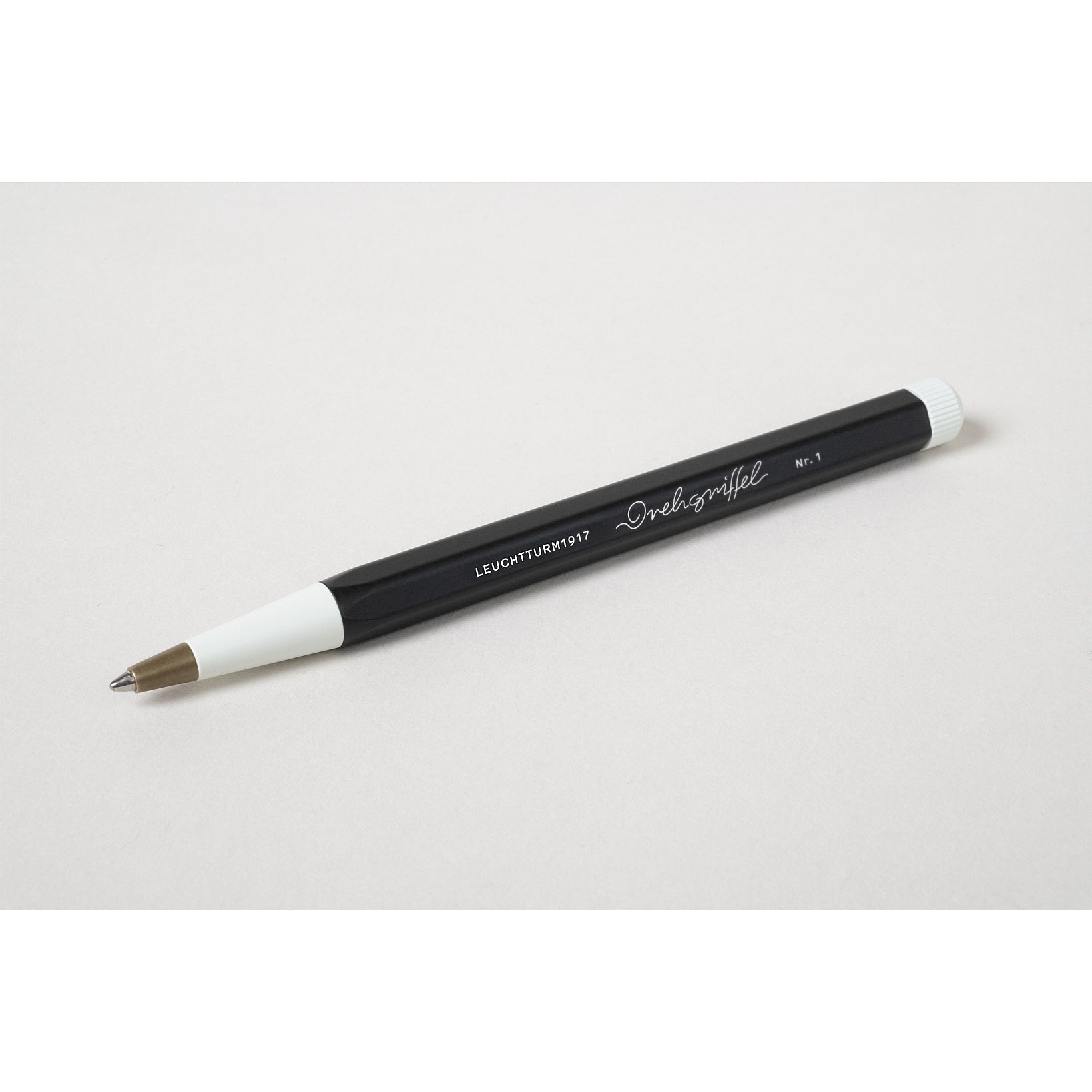 LEUCHTTURM1917 is reviving the Drehgriffel from the 1920s. The name “Drehgriffel” is a German compound noun that directly translates as twist stylus. Its characteristic design makes this writing instrument truly distinctive: a hexagonal body with a pointed tip, which, like the twist button, is in a contrasting colour. The Drehgriffel is made from precision-milled aluminium and brass, then painted and sealed. It uses a spring-loaded twist mechanism. The Drehgriffel Nr. 1 is a ballpoint with royal blue ink.
