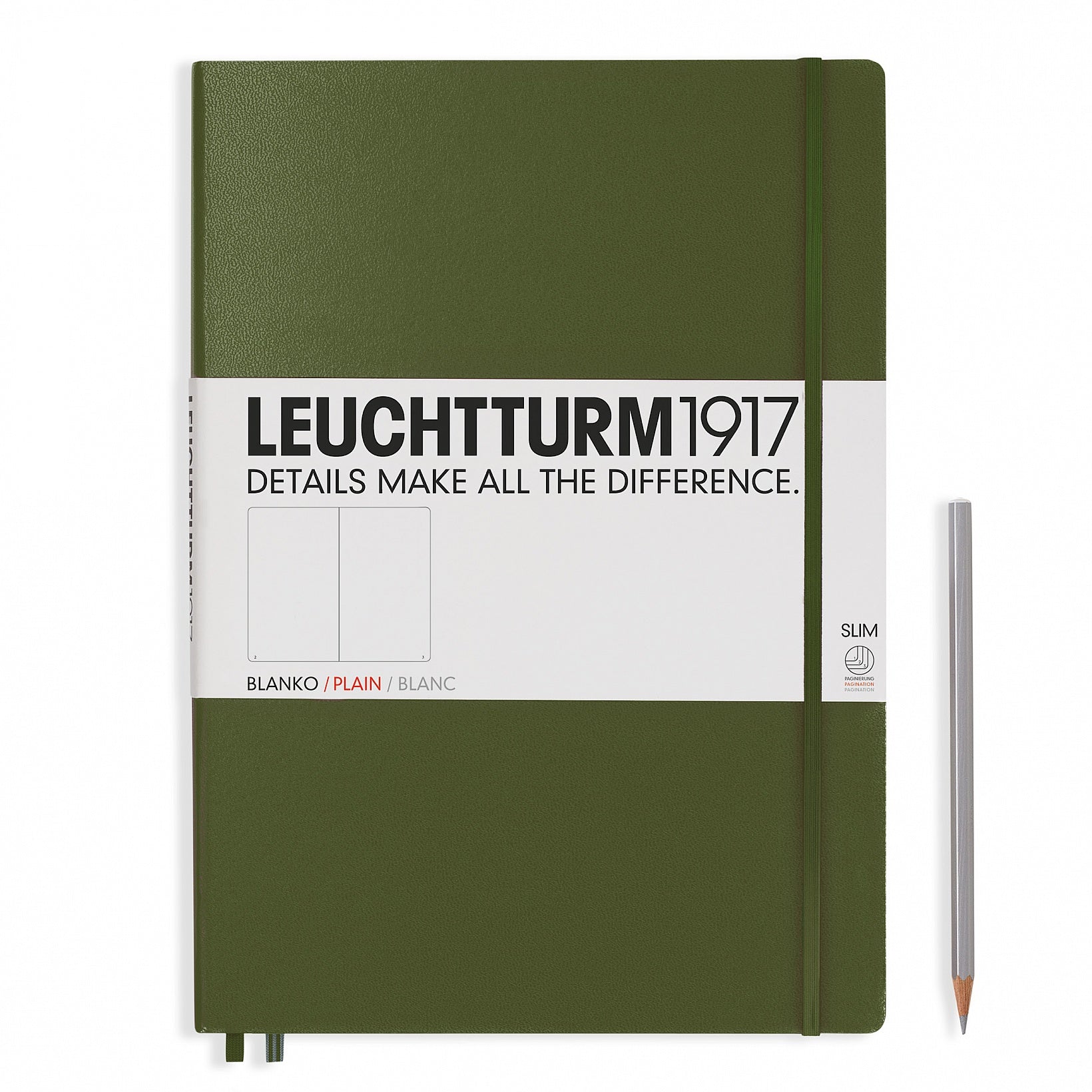 The slim alternative: our Master Slim. The Master Slim is also just larger than an A4 and can hold loose sheets between the pages and in the expandable pocket without the edges protruding. Furthermore, the Master Slim notebook features 100 g/m² paper. However, it only has 123 pages and is therefore 33% lighter than the Large journal. This means that the Master Slim is the ideal companion for all notebook-lovers who want to write in ink and always have their notebook to hand.